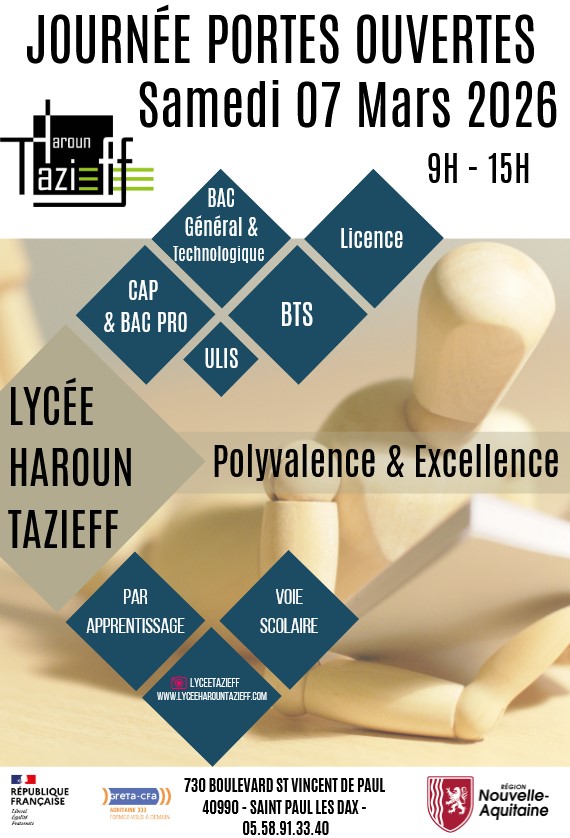 Le lycée Haroun TAZIEFF (Saint Paul les Dax) ouvrira traditionnellement ses portes le Samedi 07 mars 2026 de 09h à 15h.